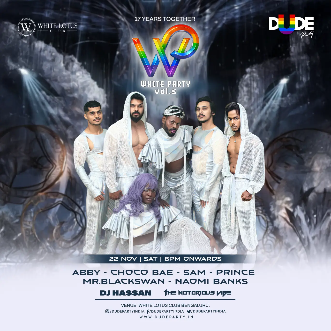 The most anticipated night of the year returns as we celebrate 17 years of Dude Party India. This edition of the White Party brings together everything that defines our journey — the community, the artistry, the energy, and the nights that shaped our legacy.
